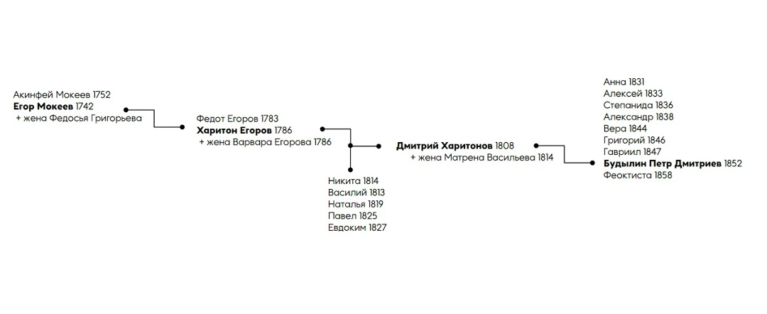 Мужская линия предков Петра Будылина. Годы рождения определены по возрасту, указанному в Исповедных ведомостях. Поскольку помещичьи крестьяне были бесфамильными, фамилию Будылин стали указывать в документах в начале XX века.