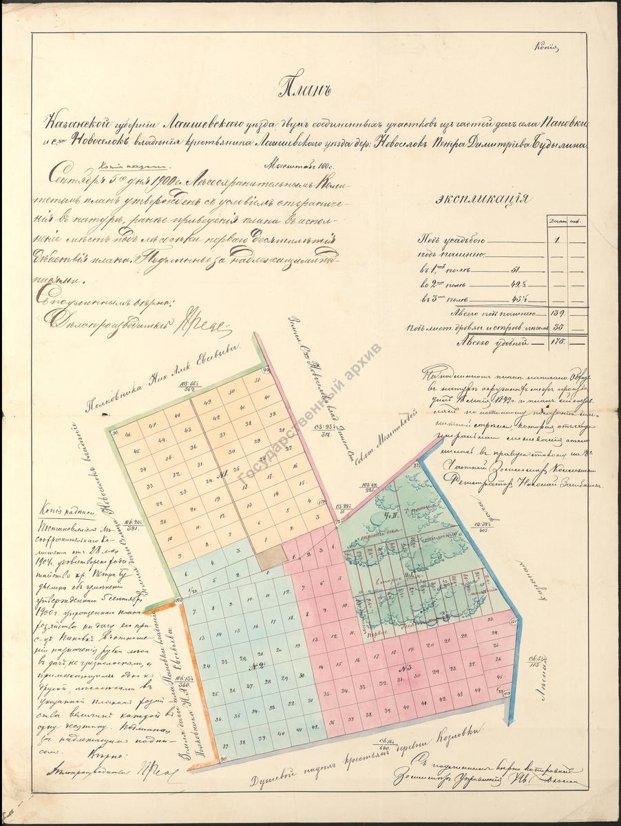 Здесь его дом указан как новый. А вот спустя 17 лет, в 1899 году, в возрасте 37 лет, Петр Дмитриевич берет ссуду в Государственном Поземельном банке на покупку земельного участка и становится владельцем вот такого усадебного надела при сельце Новоселки размером: под пашнею земли 139 десятин, под лесом 35 десятин.
