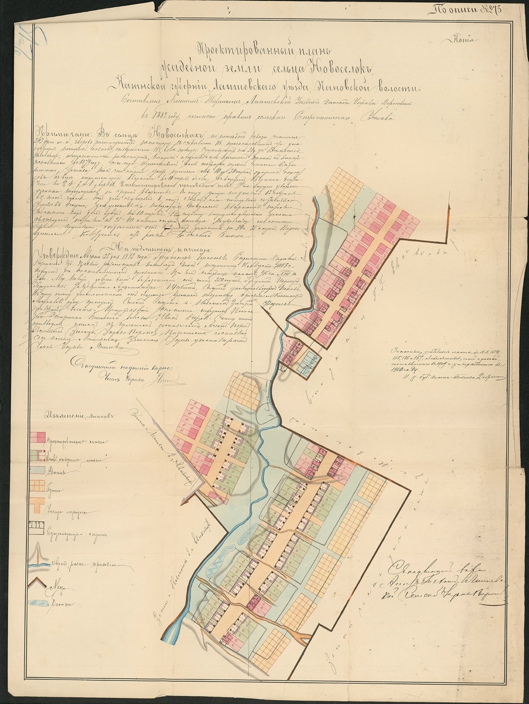 В архиве ГАРТ можно увидеть подробные карты домохозяйств Новоселка, а также сравнить, как за 3 года (с 1879 по 1882) изменились границы населенного пункта.