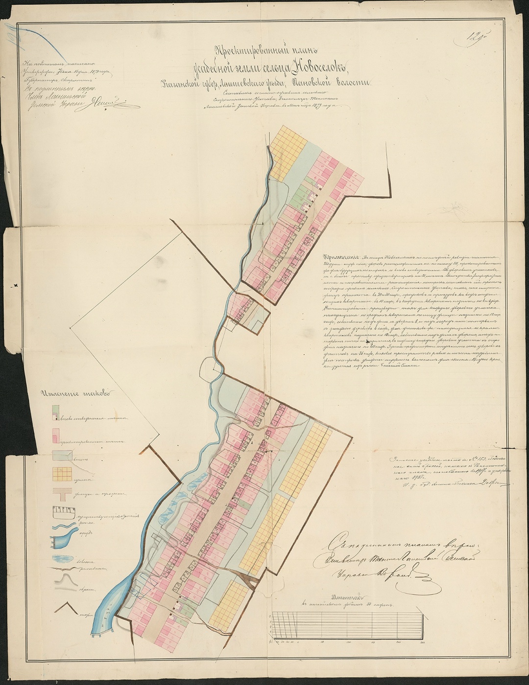 В примечании указано, что в сельце Новоселки по последней ревизии (на 1879 год - это 10ая ревизия) числится 243 души мужескаго пола, дворов, расположенных по плану - 111, проектированных для будущих построек со вновь отведенными 136 дворовых участков.