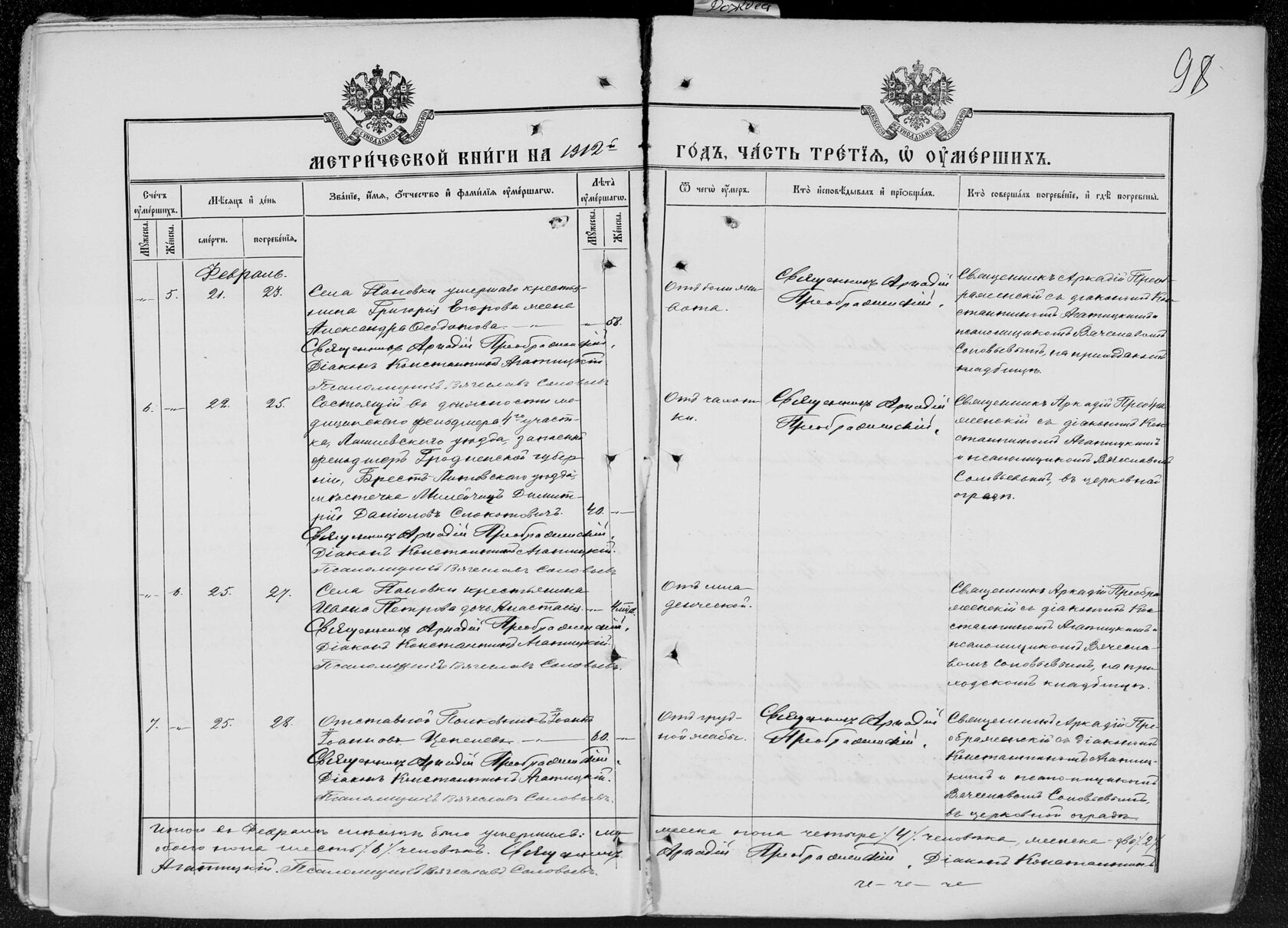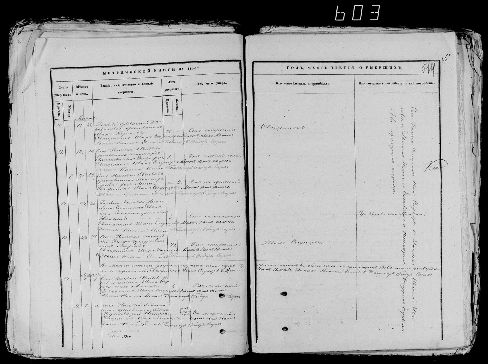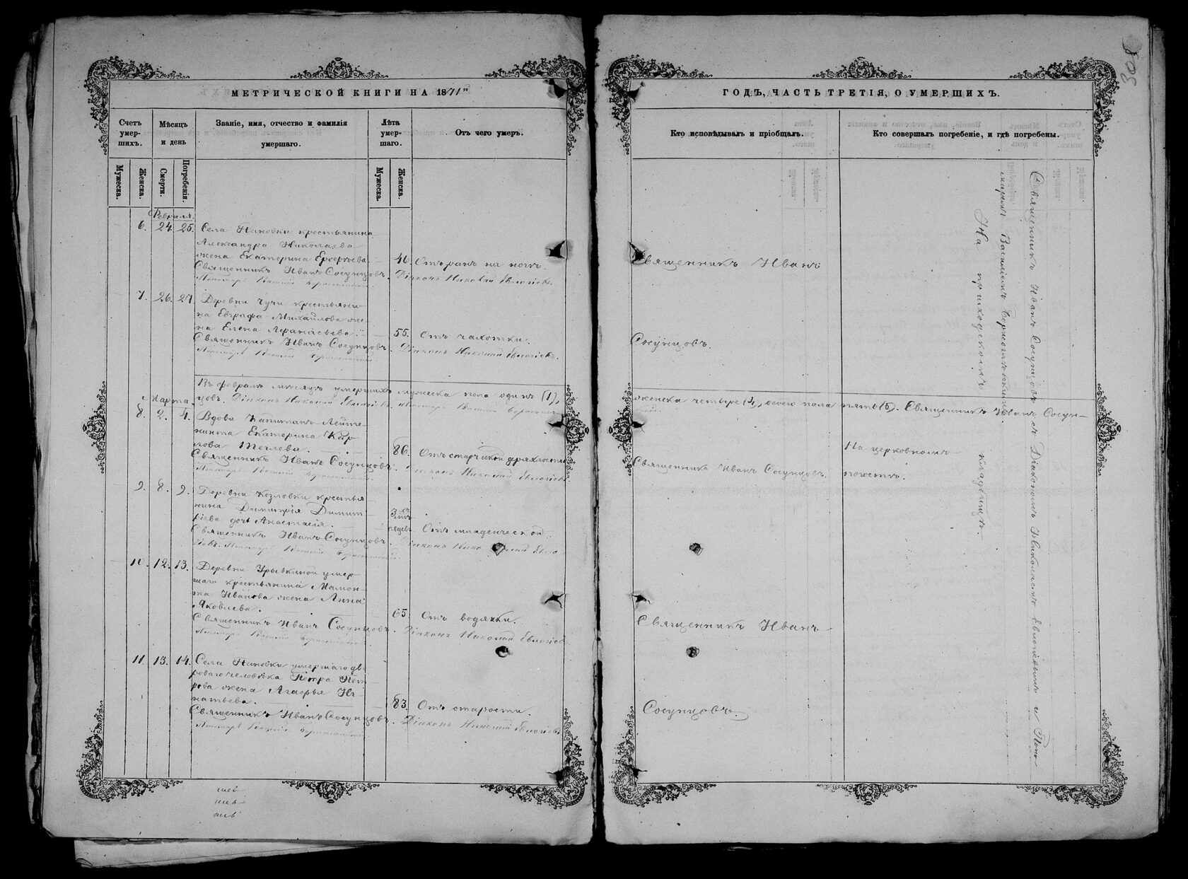 Согласно Указу Святейшего синода от 12 апреля 1833 года были установлены правила погребения в церковных оградах сельских приходов: «дозволять погребать тела местных протоиереев и священников, честно и безпорочно проходивших своё служение и христиански скончавшихся. Что ж касается прочих лиц, погребение оных при церквах в селениях допускать сколько можно реже и не иначе, как по особенному разрешению епархиального архиерея и по самым уважительным причинам, как то: в благодарность создавшему храм своим иждивением, или обезпечившему содержание причта и при том имевшему житие благозаконное и кончину не постыдную».