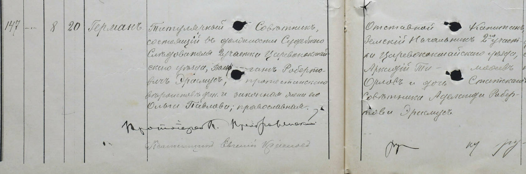 Запись о рождении сына Германа в семье Эрасмус Вольфганга Робертовича и Ольги Павловны.