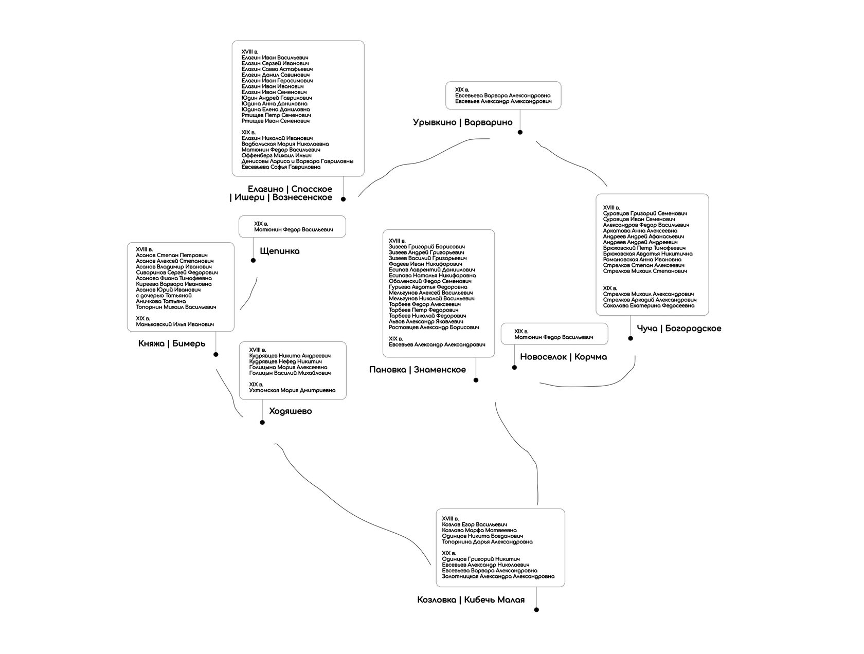 • XVIII в. Помещики: Асанов Степан Петрович, Асанов Алексей Степанович, Асанов Владимир Иванович, Сиворинов Сергей Федорович, Асанова Фиона Тимофеевна, Киреева Варвара Ивановна, Асанов Юрий Иванович с дочерью Татьяной, Аничкова Татьяна, Топорнин Михаил Васильевич.