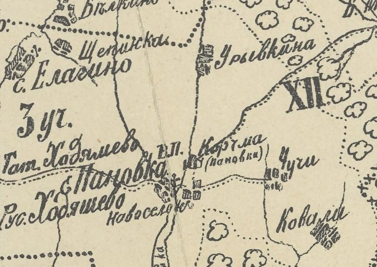 Однако, мы знаем, что спутником села Пановки была деревня Новоселок, часть которой в конце XIX века была известна под названием Корчма (Евсевьева Корчма). Она располагалась поблизости с Мамадышским трактом (бывшей Зюрейской Даругой). В документах деревня Корчма упоминается крайне редко: она есть на карте 1899 года, а также встречается в метрической книге 1913 года (в искаженном виде - “деревня Харчма”) и в книге загс 1931 года.
