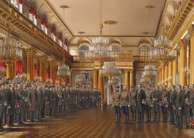 Момент представления был приурочен к 11-ти часам утра, но мы уже в 9 часов подъезжали к Иорданскому подъезду громадного Зимнего Дворца. И вот мы очутились в роскошных залах Царского чертога… Мрамор, бронза, белые ряды стройных колонн, хрустальные люстры. Чем-то царственным веяло от этих двухсветных зал, в паркете которых отражались блестящие мундиры сановников. Толпа мягко гудела и шевелилась. Здесь были представители всей земской России. Вскоре собрался весь Совет Министров. Церемониймейстеры суетились, расставляя представителей земств в алфавитном порядке губерний.