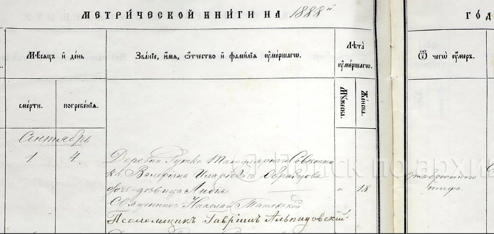 1888 год. Запись о смерти Лидии, дочери Валериана Иларьевича и Зои Александровны Образцовых. Источник: