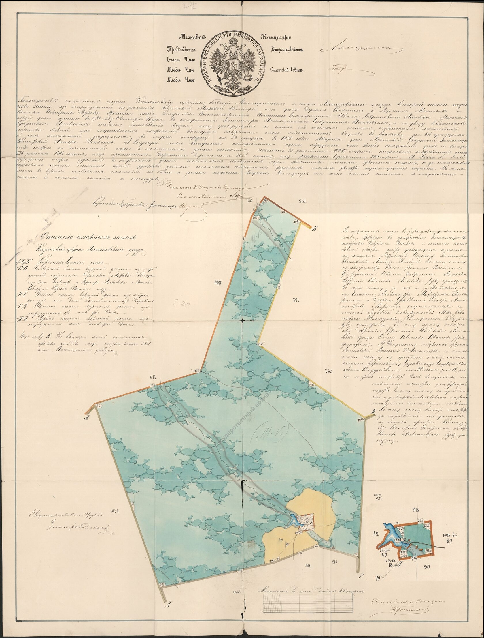 🔎 Чтобы определить месторасположение завода, рассмотрим следующую карту с прилежащими к заводу землями. По линии АБ обозначен казённый Черный лес, по остальным линиям - земля из дачи Больших и Верхних Метесков и Починка Искиюрт Трюк-Тямти.