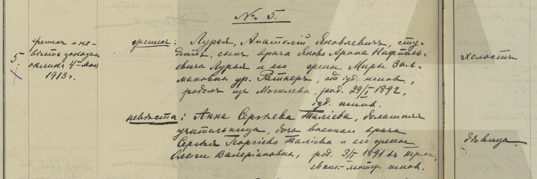 💍 Анатолий и Анна поженились в мае 1913 года, в лютеранской церкви города Москвы. К моменту вступления в брак Анна стала лютеранкой и была исключена из православной веры; Анатолий был иудеем. Его старший брат Соломон тоже перешел из иудаизма в лютеранство, однако затем формально вернулся в прежнюю веру; при этом, со слов потомков Соломон был атеистом и космополитом.