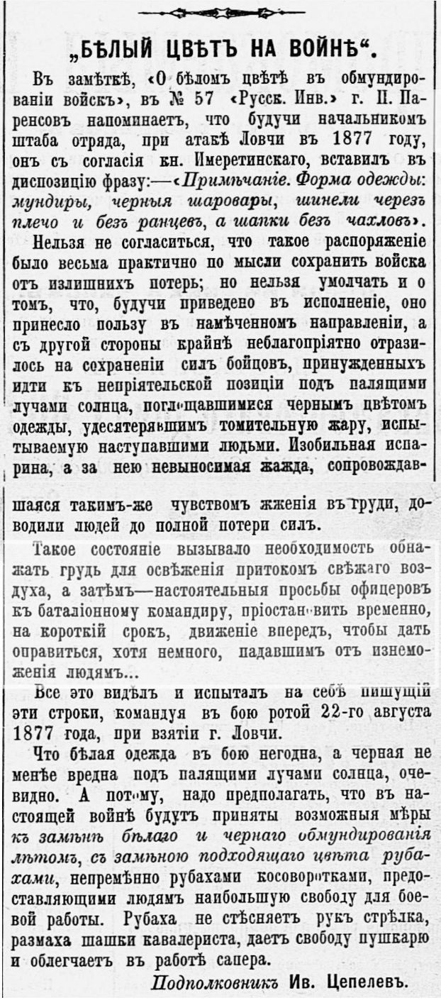 1904 г. Статья Ивана Ивановича Цепелева (старшего) "Белый цвет на войне" в журнале "Русский Инвалид" (1904 г., №65). Источник: Яндекс.Архивы