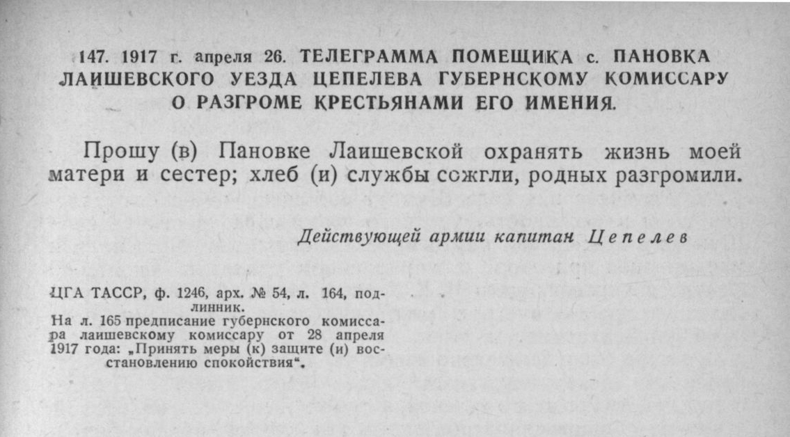 Телеграмма от капитана Цепелева (прим. - Ивана Ивановича младшего), адресованная губернскому комиссару о разгроме имения в Пановке. Источник ИБИД