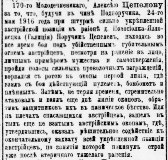1917 г. Жалование Алексею Ивановичу Цепелеву Ордена Св. Великомученика и Победоносца Георгия 4 степени за отличия в действиях против неприятеля. Источник: Яндекс.Архивы