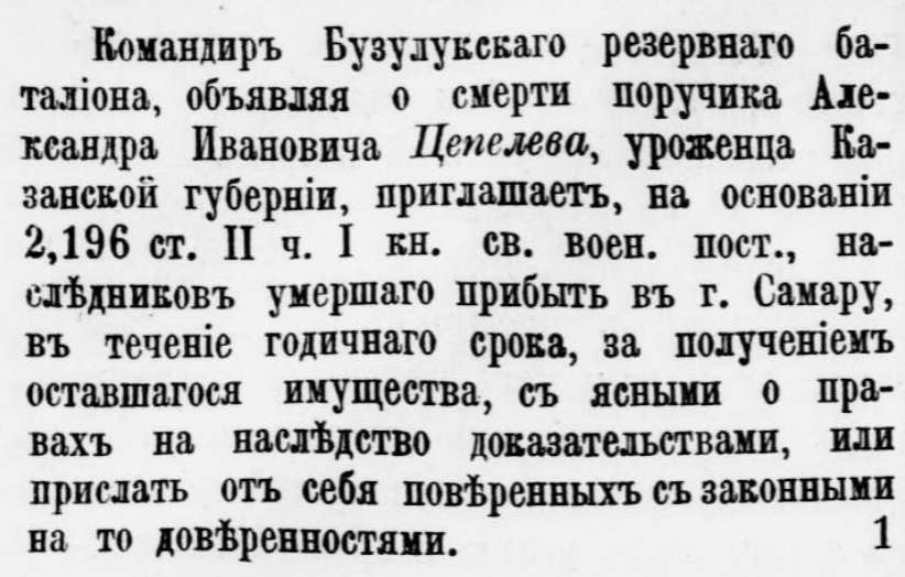 Объявление о розыске наследников Александра Ивановича Цепелева, служившего в Самаре и умершего в 1894 году. Источник: Яндекс.Архивы